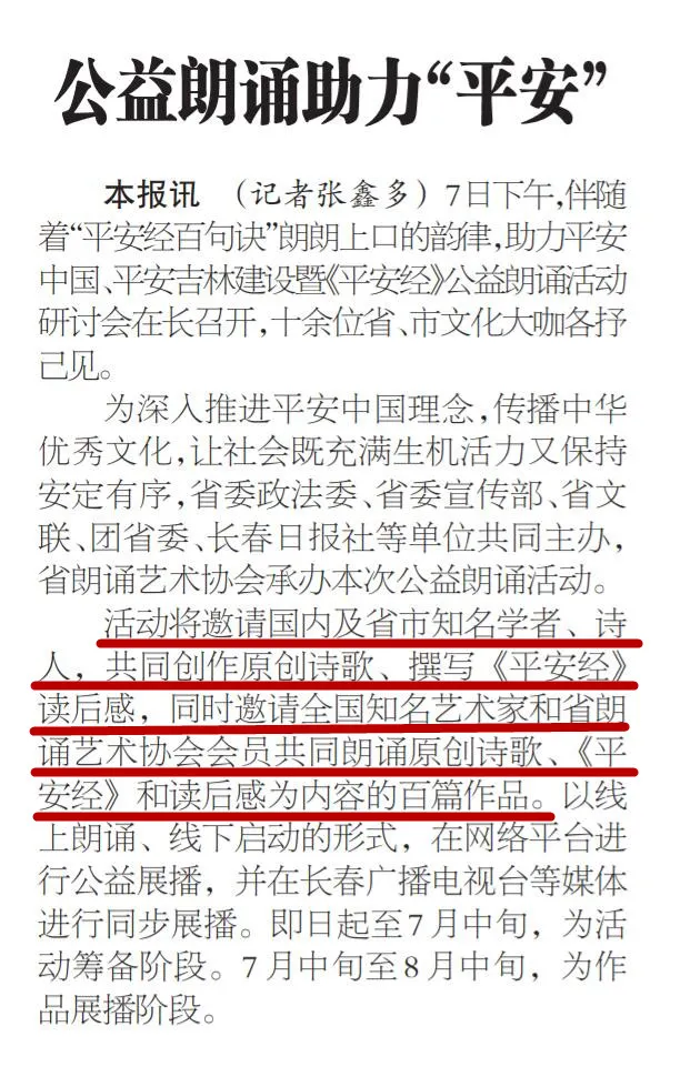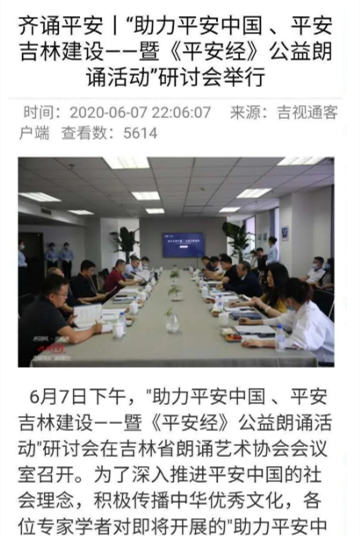 令人瞠目結舌的是,這竟然還引來了眾多衙門和名流的熱烈追捧,甚至還有官方媒體組織了“《平安經》公益朗誦活動”研討會、朗誦會等等。當地某系統、部門微信公號還曾刊發書評,稱贊此書“值得一讀”、“學者閱讀此書,頓悟平安哲理,商賈閱讀此書,企業平安無虞,民眾閱讀此書,安享世間太平”。
