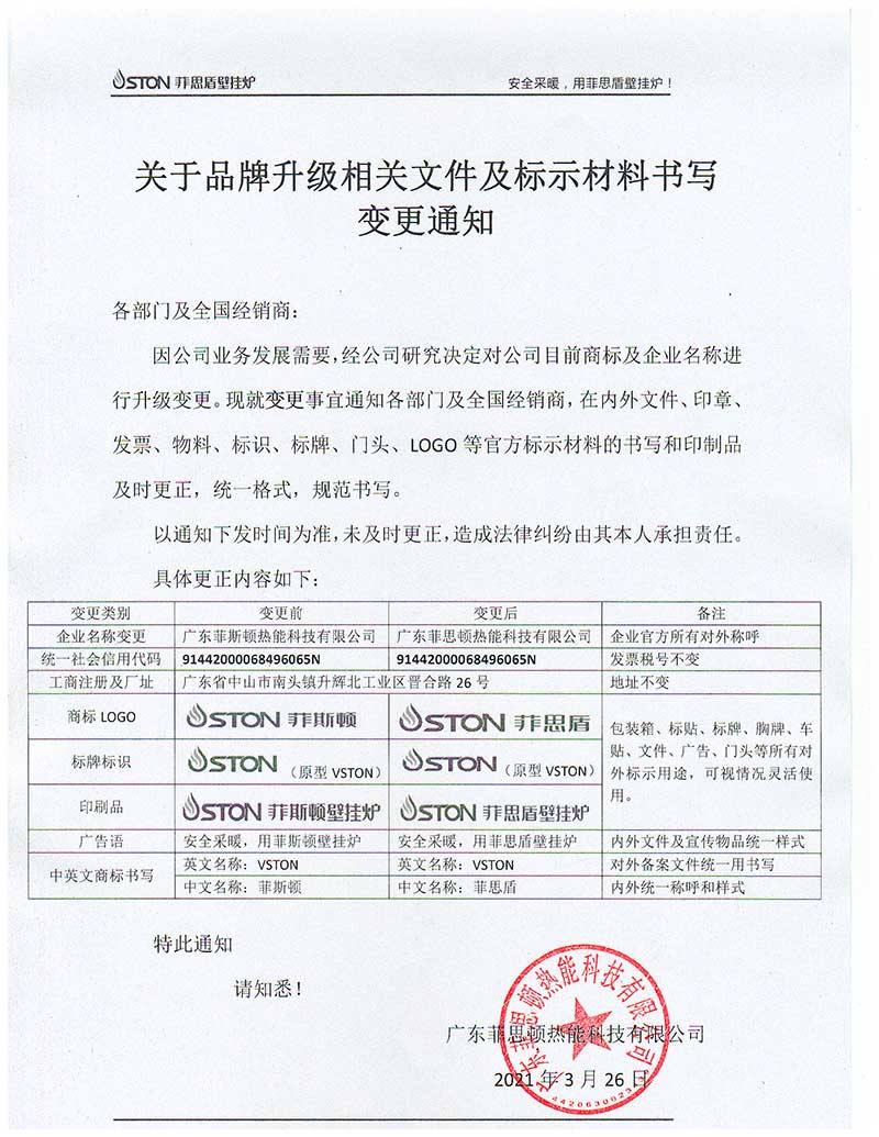 因公司業務發展需要,經公司研究決定對公司目前商標及企業名稱進行升級變更。現就變革事宜通知各部門及全國經銷商,在內外文件、印章、發票、物料、標識、標牌、門頭、LOGO等官方標示材料的書寫和印制品及時更正,統一格式,規范書寫。
