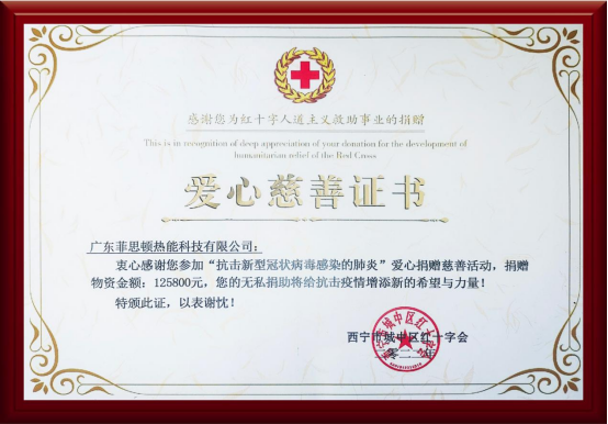 受贈方代表西寧市城中區(qū)疾病預(yù)防控制中心副主任表示感謝:“你們的關(guān)愛與支持,是我們戰(zhàn)勝疫情的強大后盾,讓我們感受到無比溫暖,為我們增添了無窮力量。同時,我們也更覺責(zé)任重大、使命光榮。在此,西寧市全體抗疫戰(zhàn)士向社會各界愛心企業(yè)、團(tuán)體、人士表示衷心的感謝!”并為捐贈企業(yè)廣東菲思頓熱能科技有限公司頒發(fā)了“愛心慈善證書”,以肯定菲思盾的愛心捐獻(xiàn)。