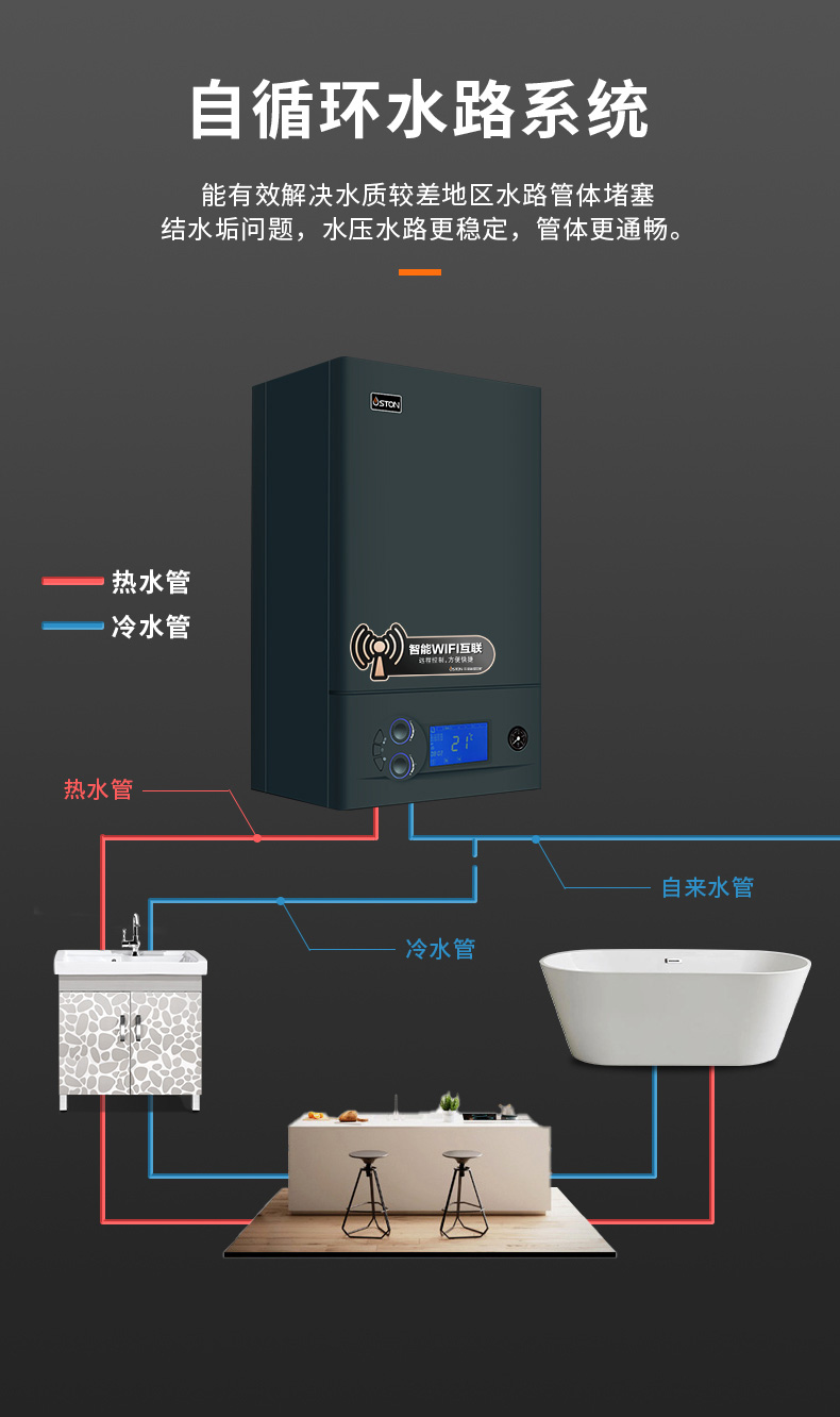 生活熱水自動恒溫,水溫控制精確±1℃,避免燙傷和凍感冒。