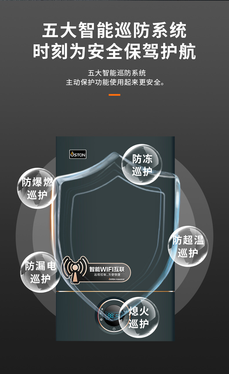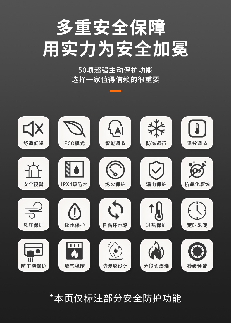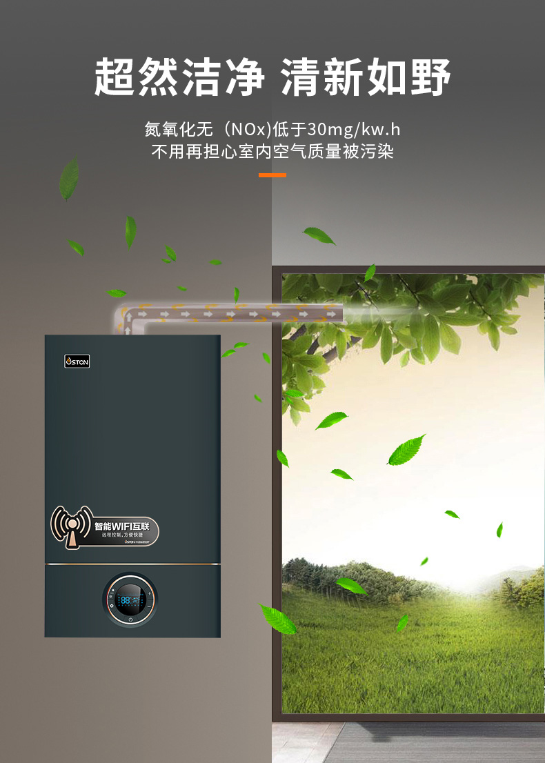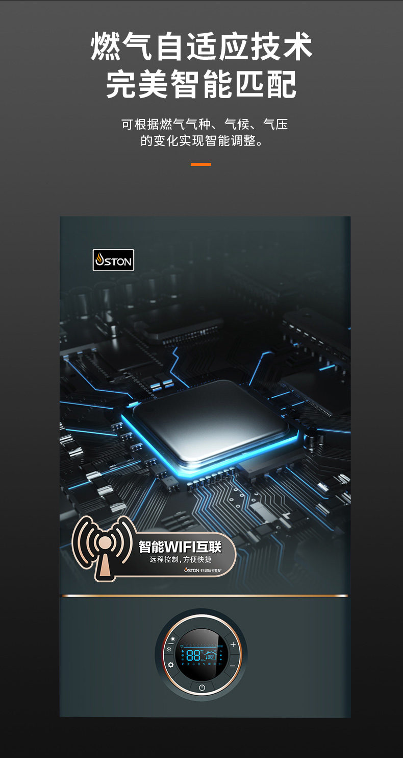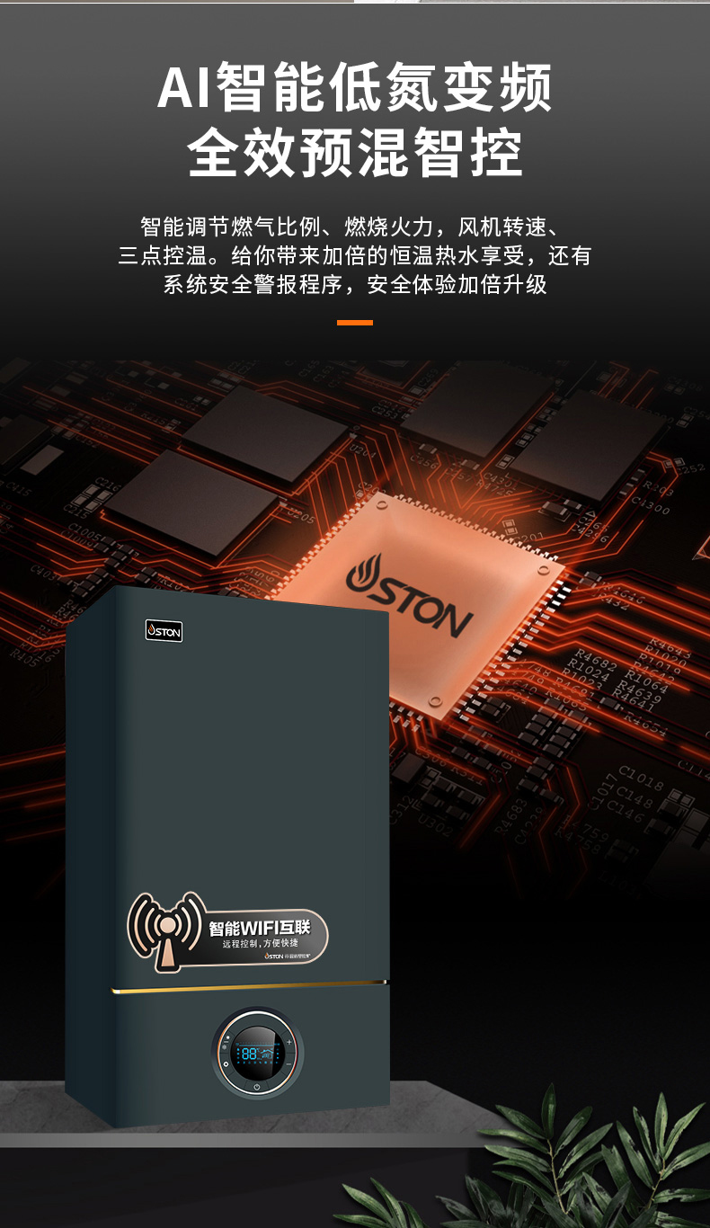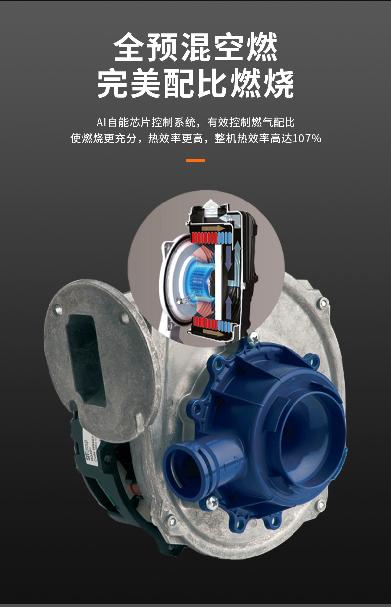 AI智能芯片集成變頻控制燃氣預混系統、燃燒系統、冷凝系統、燃氣配比,使燃燒更充分。