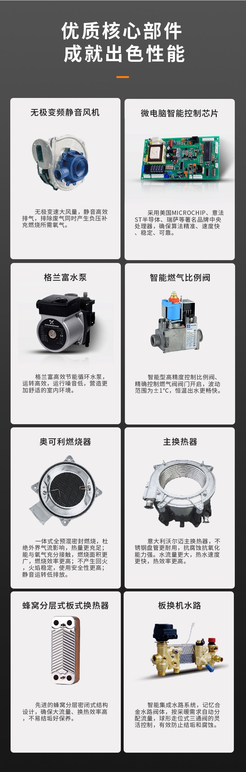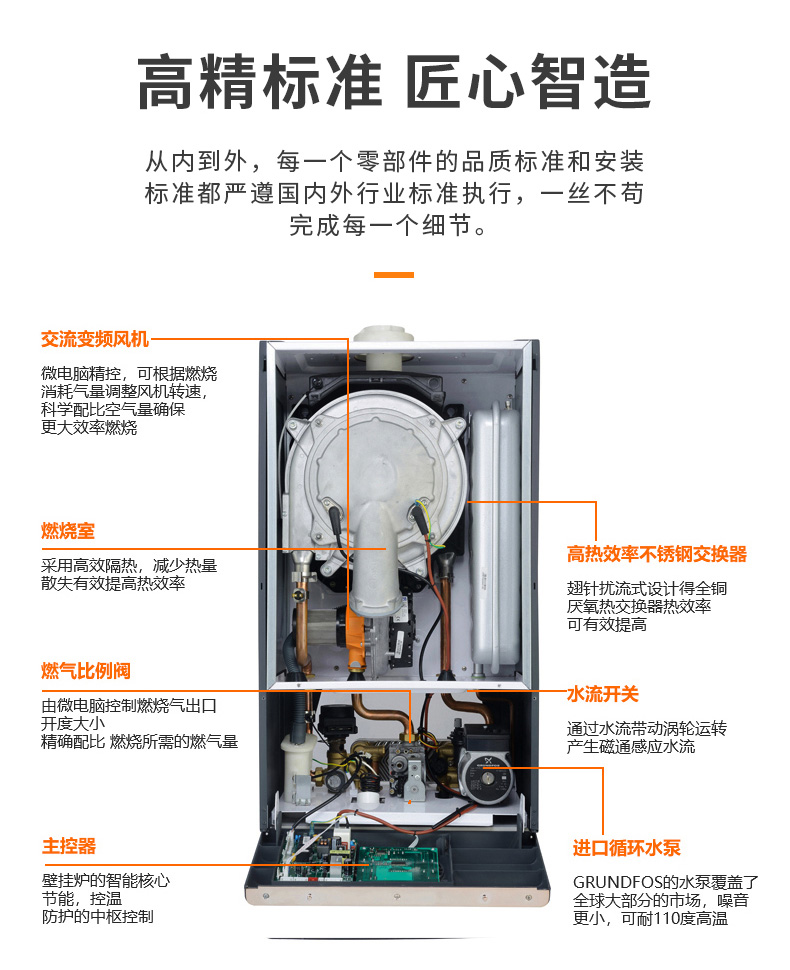 熱效率更高,意大利原裝進口Orkli陶瓷纖維燃燒器、西特高精度比例閥、SITEVDC變頻風機,